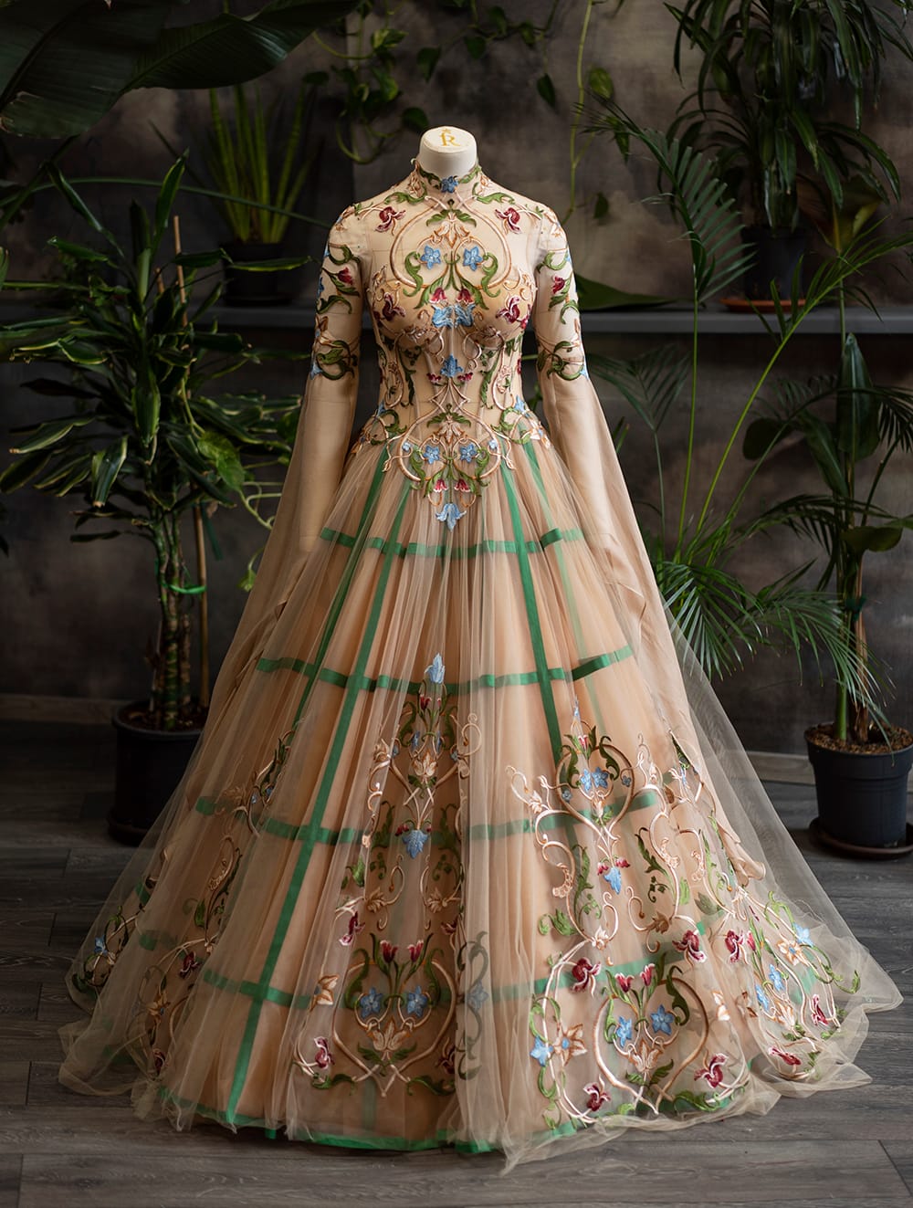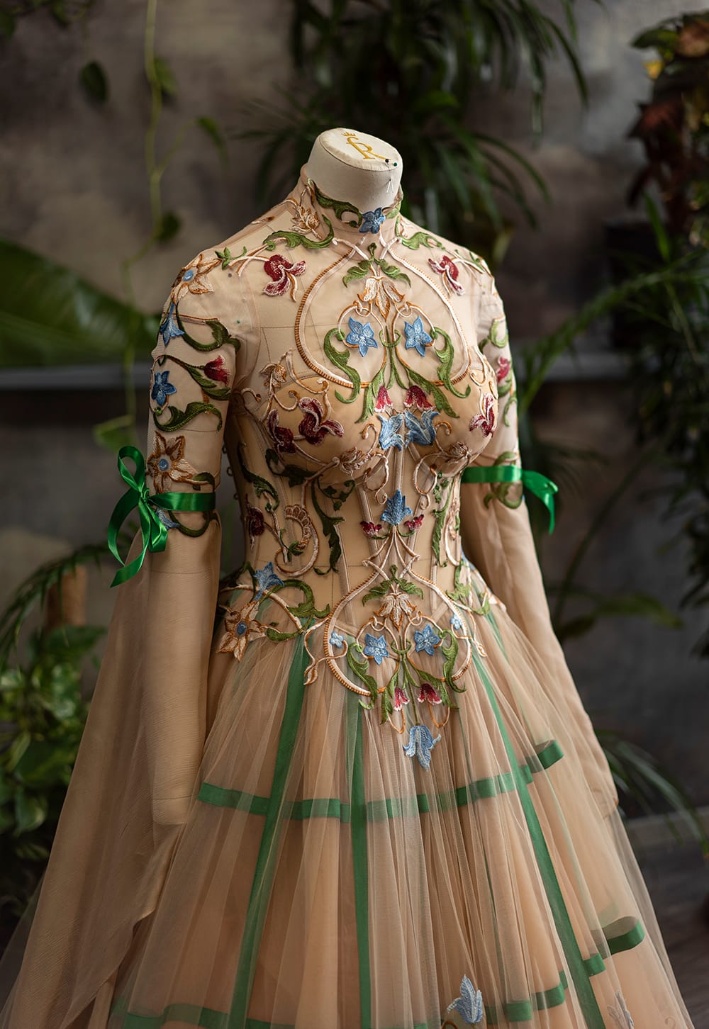 Made out of nude netting, green cage grid puffy skirt with tulle and embroiered flowers on skirt